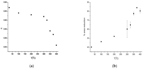 Figure 7 shows the temperature dependence of strain hardening (Figure 7a) and area reduction (Figure 7b). Strain hardening index decreases and area reduction increases as temperature increases.