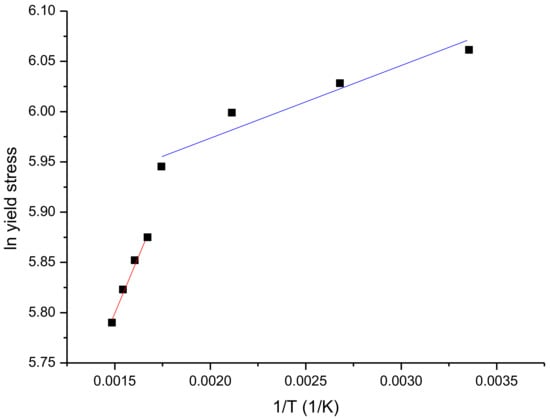 where is the activation energy for deformation (J/mol), is the ideal gas constant (8.314 J/mol K), is the stress at temperature , and is a constant that depends on the material. Figure 8 shows the logarithm of yield stress versus . The slope of the plot can be related to the activation energy. Two straight lines can be fitted at low and high temperatures, respectively, suggesting the existence of two different activation energies, and therefore, deformation mechanisms. Although the number of experimental points is limited and agreement with the experimental evidences is fair (300 °C vs. 325 °C), the general shape of the curve suggests a smooth transition of activation energy for the yield stress as the temperature is raised. The calculated at low temperature is ~0.6 kJ/mol (~0.006 eV/atom), whereas at high temperatures ≈ 4 kJ/mol (~0.04 eV/atom). The value of low temperature is in excellent agreement with that calculated by Christian and Mahajan [] for the nucleation of twins. High-temperature values are well below the reported activation energies for dynamic strain aging (DSA, 0.86 eV/atom []) thus, suggesting that the active deformation mechanism at high temperatures is dislocation slip. The results of the present study are in concordance with the findings of Jung and De Cooman [], regarding the transition in deformation mechanisms with temperature.