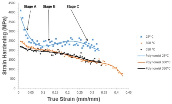 For a better understanding of the mechanical properties of the steel, the strain hardening against has been plotted in Figure 9. As can be seen, the upper curve corresponds to the tensile test carried out at 25 °C and the lower curve represent experiments made at 350 °C. This means that the maximum strain hardening occurs at room temperature, which is in accordance with the maximum difference between UTS and yield strength for this temperature (see Table 2). The meaning of this is that the twinning could be more effective in the strain hardening than dislocation glide. Metallographic analysis corroborates the twinning mechanism for low temperatures and the dislocation glide at T > 325 °C. Also, from Figure 9, in all cases, the maximum value for the derivative is related to the first stage of the tensile test, low strain, which is consistent with the fact that the material has a higher hardening capacity when it is not deformed. In turn, Figure 7 also shows a decrease in the strain hardening index, which is in accordance with the results shown in Figure 9. The curve for 25 °C shows a value for between 4000 and 1800 MPa, and the three stages (A, B, and C) that correspond to a glide dislocation predominance, start of twinning, and decrease in twinning rate, respectively, are similar to those values reported by De Cooman et al. [] for a 1 GPa TWIP steel.