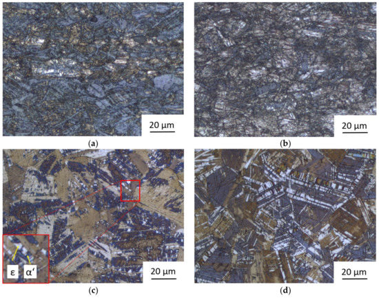 The annealed microstructures of both the materials (T15-81 and T15-82) consisted of austenite and two martensite variants: α′ and ε. The amount of ε-martensite increased with aluminium content. This is inconsistent with the findings of Ryu et al. [10] who reported a beneficial reduction in the ε-martensite amount, owing to alloying with aluminium. This difference in behaviour may be related to the difference in the carbon content. Ryu et al. worked with materials containing 0.6% carbon, whereas the sheet metals in this study contained no more than 0.12% C. It appears that carbon interacts in a certain way with aluminium and contributes to reducing the proportion of ε-martensite. Cold rolling affects the microstructure with deformation-induced transformation processes. Cold rolling, which causes an increasing of the strain in the sheet induces twinning in γ (FCC—austenite), such twins further transform to ε (HCP—martensite) and ε transforms to α′ (BCC—martensite). The larger the introduced strain, the greater the amount of martensite.