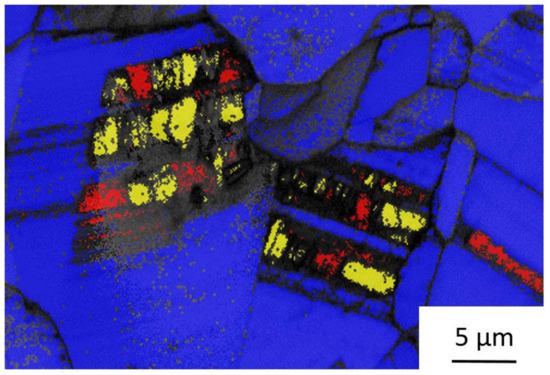 Electron backscatter diffraction (EBSD) analysis—identification of phases in annealed sheet T15-81: (α′-martensite—yellow, ε-martensite—red; γ-austenite—blue).