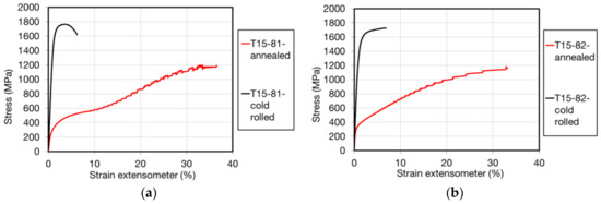 Engineering stress-strain curves of sheets in as cold rolled and annealed states: (a) T15-81; and, (b) T15-82.