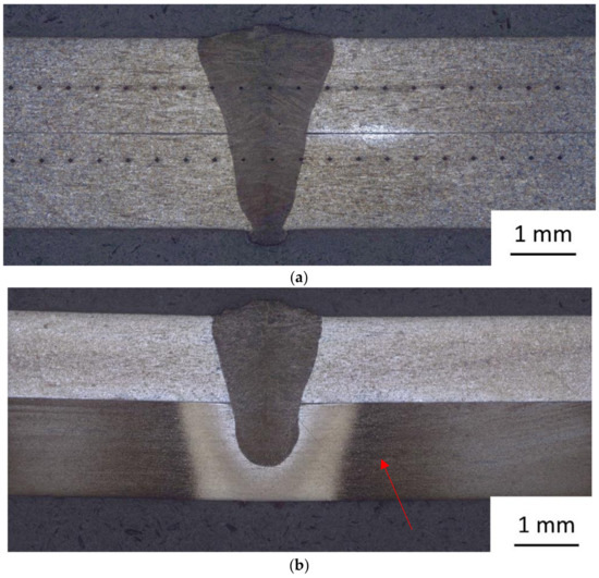 Macrostructure of welds with different combinations of sheets and laser power: (a) T15-82a + T15-82a welded with 1920 W; and, (b) T15-82a + T15-82c welded with 1650 W with heat affected zone marked with arrow.