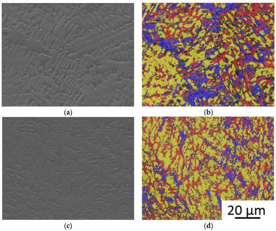 The EBSD analyses (with same magnification for all figures) of weld metals welded with different powers: (a) analysed locality in the weld 2 (1950 W); (b) Phase map of the analysed locality in weld 2—α′-martensite—yellow, ε-martensite—red; γ-austenite—blue; (c) analysed locality in the weld 5 (1350 W); (d) Phase map of the analysed locality in weld 5—α′-martensite—yellow, ε-martensite—red; and, γ-austenite—blue.