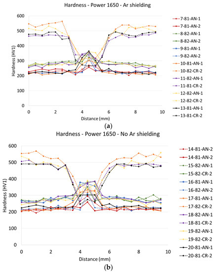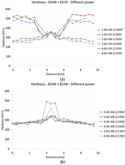 Hardness of weld joints made with various laser power levels: (a) T15-82a + T15-82c; (b) T15-82a + T15-82a (*1-82-AN-1/1950 means: Sample ID 1, sheet T15-82, annealed, 1—upper sheet, power 1950 W).