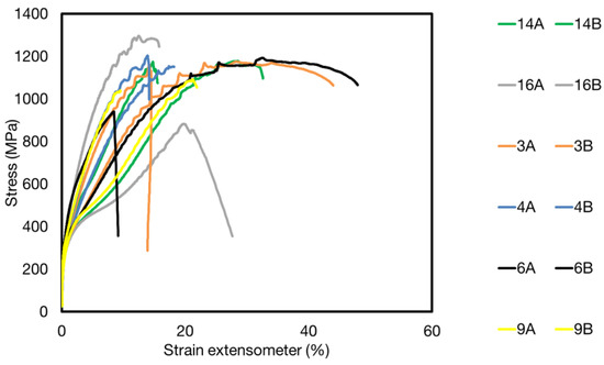 Engineering stress-strain diagrams of selected specimens: Ar shielded welds: weld 3—T15-82a + T15-82c (1650 W), weld 4—T15-82a + T15-82a (1650 W), weld 6—T15-82a + T15-82c (1650 W), weld 9—T15-81a + T15-82a; Not shielded welds: weld 14—T15-81a + T15-81a (1650 W), weld 16—T15-81a + T15-82a (1650 W), weld 19—T15-82a + T15-82c (1650 W).