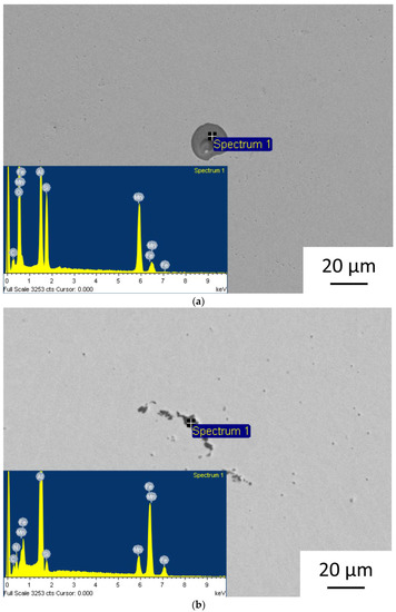 In most of the samples, intergranular brittle fracture dominated, combined with small areas of transgranular ductile fracture (Figure 13c,d). This behaviour explains the low values of elongation. There were observed numerous pores and non-metallic inclusions in the microstructure of the welds welded without the protection of shielding gas. The inclusions were mostly the complex Al/Mn/Si oxides and nitrides (Figure 14a,b).