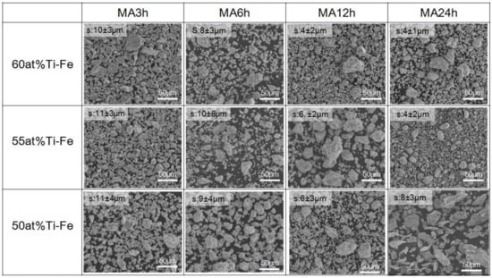 SEM images of mechanical alloying (MA) samples with different Ti-contents and milling time (inset values; s: mean particle size).