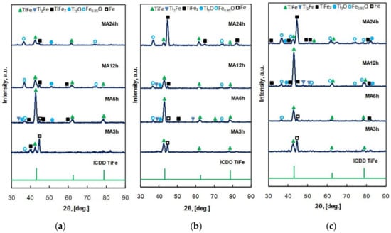 - Hotta, H.; Abe, M.; Kuji, T.; Uchida, H. Synthesis of Ti-Fe alloys by mechanical alloying. J. Alloys Compd. 2007, 439, 221–226. [Google Scholar] [CrossRef]