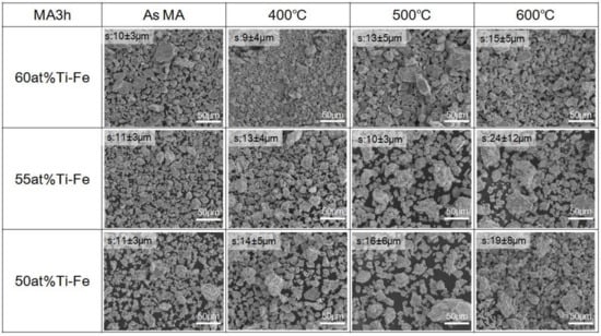 Then, in order to complete TiFe phase formation, we carried out a heat treatment for 3 h of the MA samples, as reported in Ref. [,,]. Figure 3 shows the influence of heat treatment temperature and Ti composition on the obtained particle size and morphology. With the annealing treatment, the mean particle size increases with temperature. Obtained particle size after annealing at 600 °C is about 20 μm. As a function of temperature, the surface morphology evolves, showing growth reaction between particles through neck-shaped region, particularly after treatment at 600 °C.