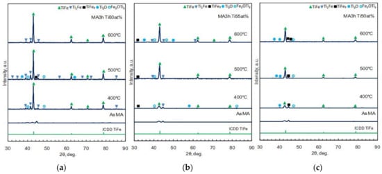 The XRD patterns of these heat treated samples after 3 h MA are shown in Figure 4. The peaks corresponding to the TiFe phase increase with the annealing temperature. This means that both the formation and crystallization of the TiFe phase could be enhanced by an additional heat treatment in vacuum furnace, as in the case of Mg-Al compounds []. Additionally, we noted that the samples with higher Ti content show sharper diffraction peaks.