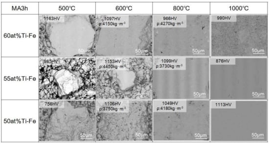 As an alternative to the classical annealing route, we have investigated the effect of SPS treatment on Ti-Fe powders milled for 3 h. Figure 5 shows SEM images of the sample surface morphology for the various investigated SPS temperatures; the results of micro-Vickers hardness tests are expressed in the upper left corner of each picture. Independently of the Ti composition, the morphology becomes more uniform with an increase in SPS treatment temperature, due to densification. Some porosity is observed in SPS samples treated at low temperatures. The hardness of SPS treated samples is somewhat higher than values reported in the literature for TiFe phase (350 HV) [,,]. This difference is attributed to the large strains induced by mechanical milling and the compression stress induced by SPS treatment [].