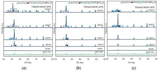 XRD patterns of 3 h MA samples undergoing different SPS treatments. (a) 60 at % Ti-Fe; (b) 55 at % Ti-Fe; (c) 50 at % Ti-Fe.