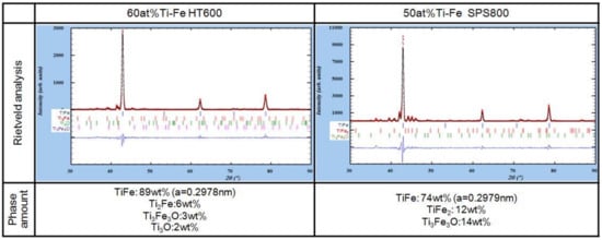Figure 7 shows diffraction patterns of 60 at % Ti-Fe alloy annealed at 600 °C and 50 at % Ti-Fe alloy SPS treated at 800 °C. From the Rietveld analysis, we identified phase composition, abundance and lattice parameters. For a 60 at % Ti-Fe alloy annealed at 600 °C, the main phase is TiFe (89 wt %), with a lattice parameter a = 0.2978 nm. In addition, three minor phases were observed: Ti2Fe (6 wt %), Ti3Fe3O (3 wt %, stabilized by oxygen) and Ti3O (3 wt %). On the other hand, for the 50 at % TiFe alloy SPS treated at 800 °C, the content of TiFe phase is lower (74 wt %), and only two minor phases are detected: TiFe2 (12 wt %) and Ti3Fe3O (14 wt %).