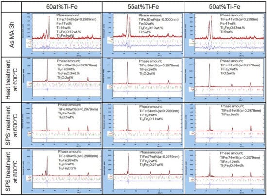 Figure 8 gathers the graphical output Rietveld analysis for the 3 h MA, heat-treated and SPS treated for the different titanium contents. Phase composition, amount, and lattice parameters for the main TiFe phase are displayed. Some unidentified XRD peaks exist in MA diffraction patterns, whereas all phases were identified in heat treated and SPS patterns. For MA samples, the lattice parameter of the cubic TiFe phase (a = 0.300 nm) is larger compared to bulk TiFe (a = 0.295 nm) []. After heat treatment, the lattice parameter shrinks (a = 0.298 nm) because of stress/strain relief. For SPS treated samples, the lattice parameter is similar to that of heat treated samples.