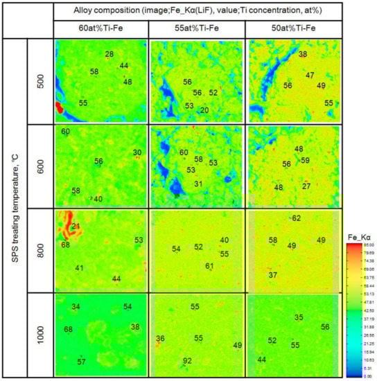 EPMA elemental mapping for Fe_Kα of SPS treated samples. Numbers in the micrographs stand for Ti concentration at specific sample locations (at %).