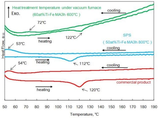 Following the synthesis of the TiFe phase, investigations about hydrogenation properties have been carried out by using a high pressure-DSC apparatus. The DSC measurements were done under a H2 pressure of 5 MPa during heating and cooling runs. Various Ti-Fe alloys were studied: a commercial product (purchased from Kojundo Chemical Laboratory, Co. Ltd., Japan, d < 100 μm), and samples synthesized by 3 h MA and subsequent heat treatment at 600 °C or SPS treatment at 800 °C. Figure 10 shows the endo/exothermic peaks according to desorption/absorption hydrogen reactions. For the synthesized alloy, the heating cycle showed an endothermic peak at around 120 °C, which was attributed to hydrogen desorption on this cycle. On the cooling cycle, the small exothermic peak at around 50 °C shows that some hydrogen uptake occurs. The sample prepared by vacuum furnace shows higher endo/exothermic peak temperatures. This is caused by some oxidation during this complex process. The reaction temperatures corresponding to these peaks are not different between commercial and our own synthesized TiFe alloy materials. Moreover, the hydrogen absorption characteristics of these alloys showed a good repeatability during the second DSC run, showing a fully reversible reaction, as discussed in literature [,,]. Our SPS 800 °C treated sample was also measured on a Sieverts apparatus. It absorbed without any activation, contrary to most previous reports. Compared with the literature, the SPS sample presented good kinetics in both hydrogen absorption and desorption. The elapsed time for 90% of full absorption was 180 s under 5 MPa of Hydrogen at 40 °C. This hydrogen absorbing/desorbing kinetics is similar to that of previous reports [,,,]. From the PCT measurement at 40 °C, the sample could absorb 0.75 mass % reversibly, and hydrogen plateau pressure is 2.5 MPa for absorption and 0.7 MPa for desorption. This represents a larger hysteresis compared with Ref. [], which could be explained by the high hardness of the material []. The smaller capacity compared to commercial TiFe (1.8 mass %) can be partially explained both by the phase abundance (74 wt %) and this higher absorption pressure.