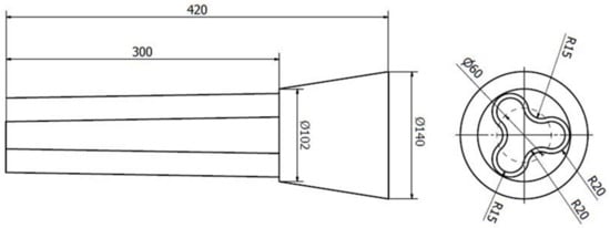 It is common knowledge that the molten metal velocity should equal approximately 0.5 m/s to ensure a proper (not too slow and not too fast) mold cavity filling process []. Yet, this is very difficult or is sometimes nearly impossible under normal gravity pouring conditions when using a simple, old-fashioned gating system. Thus, a special gating system design is crucial, although simple channel cross-section changes are not enough to significantly change the character of the metal flow [,,,]. In the presented research, authors resigned from implementing offset pouring basin, gating systems will be filled using contact pouring method, as it allows for isolating the metal from the surrounding atmosphere []. The experiments that are described in this article constitute the computer modelling part of a large experimental plan to develop a scientifically optimized and practically useful molding technology for heavy (up to 25–30 tons) steel castings. The foundry plant where the industrial part of the research will be completed in the near future cannot achieve better performance due to an excessive level of internal and surface defects. At present, both the internal and surface quality of the castings are too often outside the specifications, and there is significant evidence to show that the reason might be improper pouring process control. Thus, this problem has both scientific and practical meaning. Several gating system designs were examined for model simple casting, which is a typical clover-like sample whose geometry is shown in Figure 1. This sample is used as an obligatory cast for every melt in the steel foundry to check the main mechanical properties; its quality is nearly as important as the real casting quality. Moreover, the gating system that is used for the sample is more or less the same as those that will be used in actual production.
