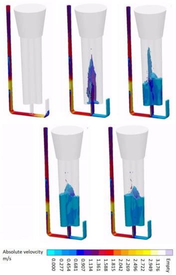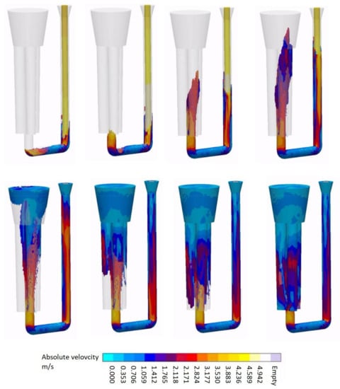 It should be noticed that the velocity in the sprue is almost constant, which is a perfect outcome, proving that this design of the downsprue is a vital improvement to the process. When the flow enters the ingate area, its velocity is in the range of 1.2–1.4 m/s, but the additional runner part, which is curved vertically to the top, makes its almost acceptable. However, a turbulent character is still visible when the alloy enters the mold cavity, although this effect can be decreased by increasing the length of the prolonged runner. The process stabilizes after a few seconds (the total filling time is 10 s on average), but the splashes are still too excessive. It must be mentioned that the prolonged runner can be the place for the non-metallic inclusions (oxides, loose sand grains, etc.), capturing some portions of them and improving the internal cleanliness of the casting.