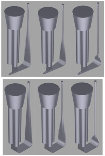 Nearly all of the bottom-top ladles have circularly shaped nozzles that should constitute the initial shape of a gating system. The tapering of the sprues’ cross-section should change according to the hyperbolic curve, as it depicts the actual nature of the stream [,,]. The authors of this paper noticed in their most recent studies that liquid metal flowing through runners having different shapes and circumference and the same cross-section area tend to behave differently, i.e., the slimmer the runner, the lower the potential metal mixing takes place and the more laminar the flow is, which is why it was decided to study rectangular-shaped runners. The authors examined the transition of the downsprue from a circular to a rectangular shape. The best results were obtained when the transition took place on the longest section possible, i.e., the shorter the length of the transition, the more turbulent the flow. Tests included a triangular ending of the runner with a perpendicular ingate, although this solution increased the jetting effect and created an uneven velocity in the runner, so it was found to be inefficient. Tens of modelling iterations were conducted, but only some of them were selected and representative examples are shown. In the foundry, designers with some knowledge regarding downsprue tapering do indeed try to taper it, but the results will be far from perfect when it is not done properly (see Figure 4).