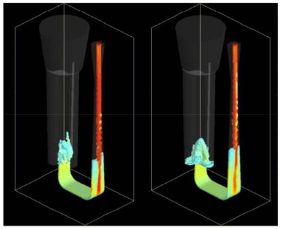Even though the liquid alloy velocity is not too poor in the mould cavity entrance (ca. 0.8 m/s), it is observable that the metal flow in the downsprue has no contact with its walls, thus a huge sucking pump effect appears and the gas porosity ratio in the sample casting is high. The aim of the experiments was to achieve a stable, uniform metal flow with a velocity that is no higher than 0.5 m/s during the decisive moments of the pouring process. Thus, further research was done using an increasingly more complex and sophisticated gating system starting with a prolonged runner, vortex gate and spin trap, and ending with a combined trident gate system [,,,].
