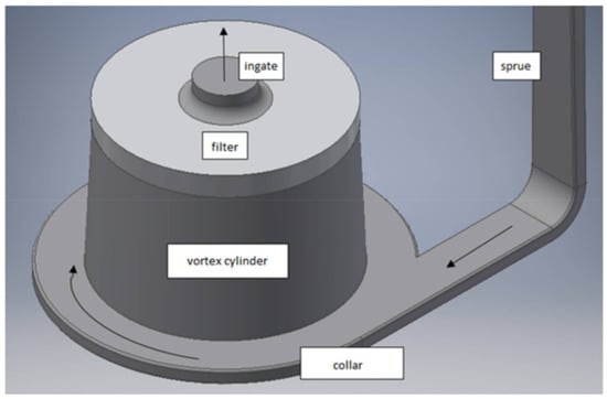 Another modification that was checked in the experimental procedure concerned the so-called vortex gate, whose concept is presented in Figure 6. A special cylindrical volume is shaped directly below the ingate and it is equipped with a filter system of various geometry, which mostly depends on the casting size. The sprue is joined to the chamber at the outer diameter, generating that vortex so that two effects are present, namely the metal flow velocity is directed downwards to the acceptable limit and the impurities should be captured by the filtering system.