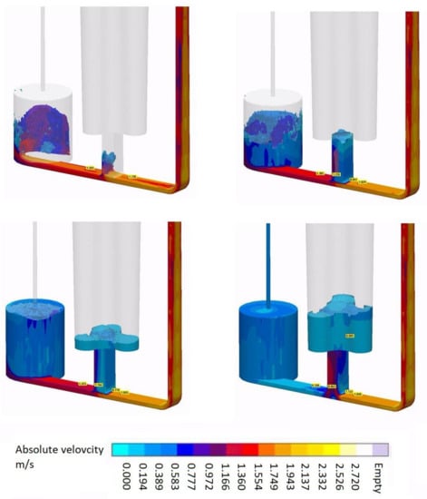 As is observable in Figure 7, the vortex system works quite well, thus the metal flow velocity is uniform during the mold cavity filling and its value is ca. the desired 0.5 m/s. Also, the purity of the alloy should be much better because of the filtration of the non-metallic inclusions, as the filter keeps them from entering the mold cavity. However, there is a problematic issue with the vortex gate where the bubbles are held in the middle by centrifugal force. This may result in the penetration of the filter by the bubbles when they merge and reach sufficient floating power. The 10 s filling duration is enough to give ample time for entrapped air bubbles to float onto the surface, so the overall internal quality should be better than in the case of the prolonged runner. The proper height-to-diameter ratio of the spin trap will be a topic of further experiments to maximize the yield, while maintaining the effect of vertical velocity reduction.
