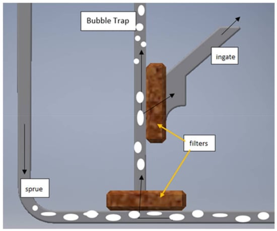 The most complex and engineered is the so-called trident gate, with a combination with a spin trap and an additional bubble trap to take advantage of all the above solutions. Figure 10 presents an approach in which two ceramic filters were perpendicularly located, according to Campbell’s guidelines []. The spin trap was added by the authors after very promising results were obtained, as described earlier. Modelling was conducted for the gating system and the results are presented in Figure 11.