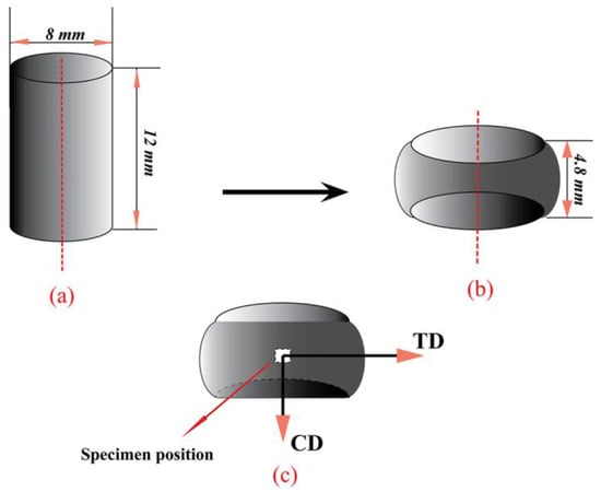 Schematic of isothermal compression and viewing position (CD and TD represents compressing direction and tranverse direction, respectively): (a) undeformed sample; (b) deformed sample; (c) sample position.