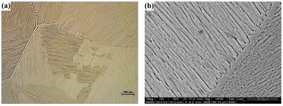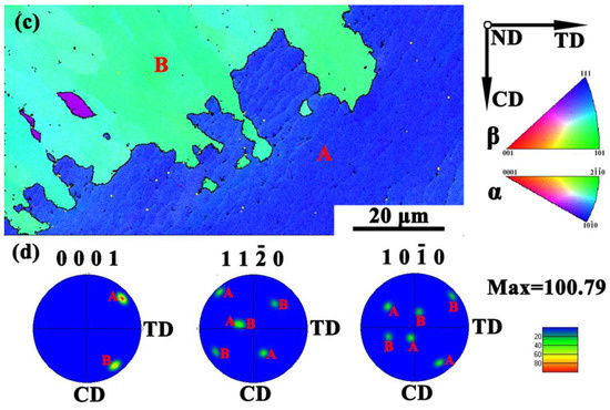 The initial microstructure was lamellar and had Widmannstatten morphology (Figure 2 and Figure 3). It consisted of large prior β grains of about 6–7 mm separated by a grain boundary α layer of 5 μm thick. The α lamellar colonies formed inside the prior β grains, and α lamellae, which formed on the prior β grain boundaries, maintained a Burger’s relationship with their parent β matrix [14,15,16]. The thickness of the α lamellae was about 3 μm, and a continuous β layer of approximately 1μm thick was distributed in between the grain boundary α and the Widmannstatten sides-plates. As shown in Figure 3c,d), the texture of the scanned area consisted of two components. The stronger one can be expressed by Euler angles as (ϕ1 = 132°, Φ = 75°, ϕ2 =38°), which is represented by A in the pole figures. Additionally, the weaker one is represented by B and can be expressed by Euler angles as (ϕ1 = 38°, Φ = 75°, ϕ2 = 10°). The textures all rotated approximately 75° from ND toward TD (ND represents the normal direction).