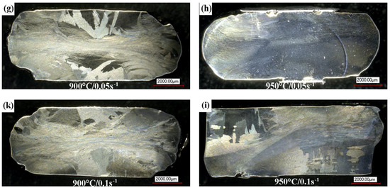 Macro pictures of Ti-6Al-4V sample deformed at (a) 900 °C/10−3 s−1; (b) 950 °C/10−3 s−1; (c) 900 °C/5 × 10−3 s−1; (d) 950 °C/5 × 10−3 s−1; (e) 900 °C/10−2 s−1; (f) 950 °C/10−2 s−1; (g) 900 °C/5 × 10−2 s−1; (h) 950 °C/5 × 10−2 s−1; (k) 900 °C/10−1 s−1; and (i) 950 °C/10−1 s−1.