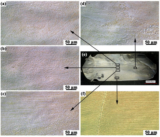 Figure 5a–d,f exhibits different microstructures at various positions of Ti-6Al-4V sample compressed at a temperature of 900 °C and a strain rate of 10−2 s−1. According to Figure 5, three different deformation zones could be defined: “dead” zone at bottom and top areas near the contact surfaces, partial plastic deformation zone close to the both sides, and severe plastic deformation zone in the center. In this study, the microstructures of inner severe plastic deformation zone are determined.