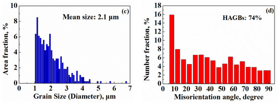 Microstructure and microtexture of Ti-6Al-4V specimens deformed at 900 °C/10−3 s−1: (a) the orientation map; (b) pole figure; (c) distribution of grain size of α phase; and (d) grain boundary misorientation of α phase.