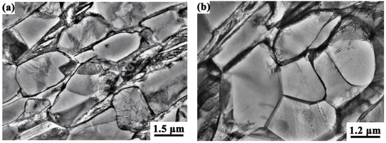TEM images exhibited the detailed information of the globularization of α lamellae (Figure 10 and Figure 11). As shown in Figure 10a,b, shearing of the α lamellae and splitting of α/α boundaries were observed, and formation of subgrains was observed inside the α phase (Figure 10c,d).