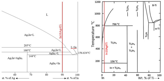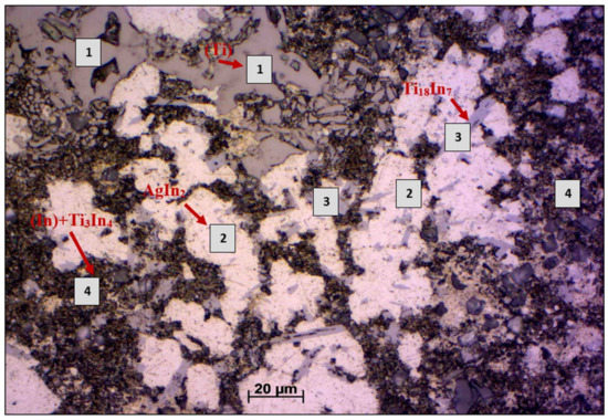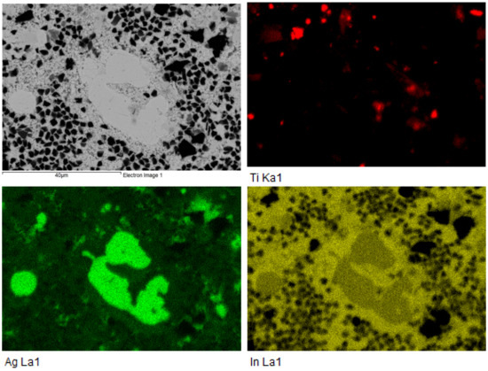 The fourth peak, at 245.6 °C, represented the termination of melting of the components in the Ag–In system—Figure 4. The titanium phase, Ti3In4, which occurs in the matrix of the indium solder, was not yet fully molten at this temperature. In accordance with the binary diagram of In–Ti [21], this phase will be fully molten at 796 °C—Figure 4.