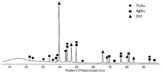 Diffraction XRD analysis of the In10Ag4Ti solder has proven the presence of solid solution (In), intermetallic phase AgIn2 and the presence of intermetallic phase titanium Ti3In4. The record of the diffraction analysis is documented in Figure 7. The solid solution (Ti) and intermetallic phase (Ti18In7) occur in the matrix only scarcely and were undetected by XRD analysis.