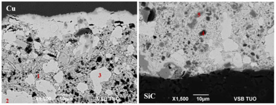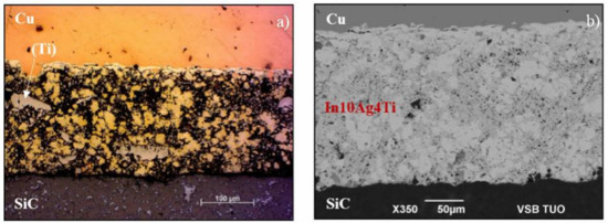 The SiC–In10Ag4Ti–Cu soldered joint was fabricated at 230 °C. Owing to ultrasound activation, an acceptable bond was achieved using a soldering process that did not contain cracks or other irregularities. The microstructure of the soldered joint is shown in Figure 9.