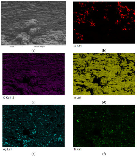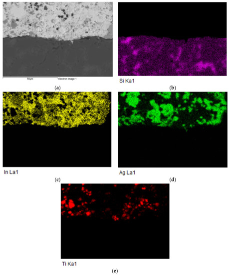 The fractured surface, on the side containing SiC ceramics, remained completely covered with solder. A ductile fracture occurred within the solder. An analysis of the planar distribution of Si, C, In, Ag, and Ti elements was carried out on the fractured surface, as is documented in Figure 18b–f. Regarding the planar distribution of Si, which represents the SiC ceramics in Figure 18b, local spots may be observed, caused by ripping out of solder from the substrate surface.