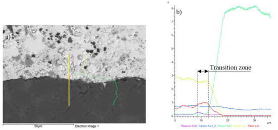 The line EDX analysis of the SiC–In10Ag4Ti joint (a) transition zone with a marked line; (b) concentration profiles of Ti, C, Si, In, and Ag elements.