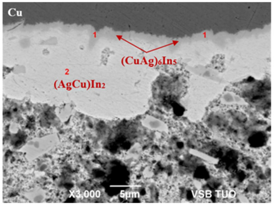 The (CuAg)6In5 phase was narrow, with a thickness of approximately 1 µm, this was more similar to copper and had a higher Cu content when compared to Ag. The (CuAg)6In5 phase, shown in Figure 14, corresponded to the composition at the point of Spectrum 1. The (AgCu)In2 phase was closer to the solder and had a higher silver content (approximately 23 wt %), when compared to copper (approximately 7 wt %); it was wettable by the solder. The (AgCu)In2 phase was relatively heavy with a thickness of up to 13 µm. It corresponded to the composition at the measured point in Spectrum 2, see Table 6.