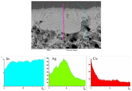 The results of the EDX point analysis were proven by the course of concentration profiles of In, Ag, and Cu elements in Figure 15. An increase in concentration of Ag can also be observed. This relates to the formation of IMC (AgCu)In2, which contains up to 23 wt % Ag.
