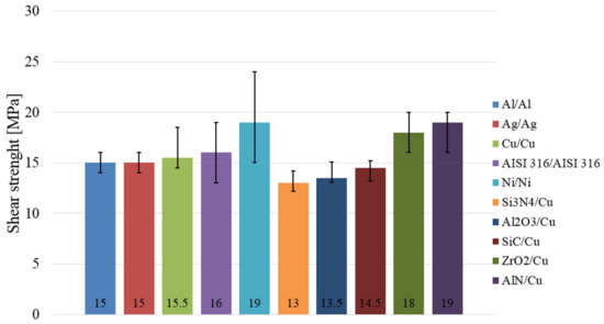 The ceramics were always tested in combination with a copper substrate. The metals were mutually tested as Cu–Cu, Ag–Ag, etc. Measurements were performed with 3 specimens of each material. The results of the average shear strength testing are documented in Figure 16. Marked deviations represent the minimum and maximum values measured.