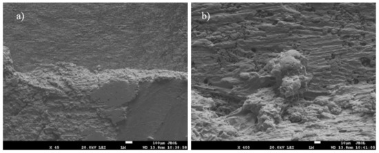 Fractured surface of soldered joint of SiC–In10Ag4Ti–Cu (a) 45 times magnification, (b) 400 times magnification.