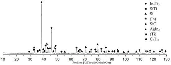 Nevertheless, it was found that Ti from the solder locally reacted with the surface of the ceramic SiC material at the formation of new phases. Thus, two minority phases, namely the titanium silicide, SiTi, and titanium carbide, C5Ti8, were identified, which proves the interaction of titanium with the surface of the SiC ceramics. The record of XRD analysis is documented in Figure 19. Besides the SiTi and C5Ti8 phases, other minority phases, such as (In), (Ti), AgIn2, and Ti3In4, were also proved by EDX analysis.