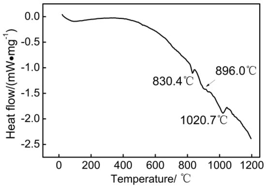 The chemical composition of the ZCuSn10P1 alloy used in this study is listed in Table 1. The alloy had liquidus and solidus temperatures of 1020.7 °C and 830.4 °C, respectively. Measurements by differential scanning calorimetry (STA 449F3, NETZSCH, Bavaria, Germany) were carried out on about 10 mg samples obtained from the as-cast alloys under an argon at a heating rate of 10 K·min−1, as shown in Figure 1.