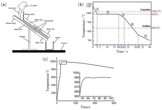 Schematic illustration of the: (a) ECSC equipment; (b) forming process curve; and (c) temperature recording curve during slurry transfer ① ECSC process, ② slurry transfer, ③ mold filling,④ holding pressure, ⑤ parts air cooling.