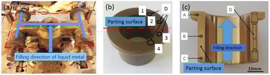Mold map and the product of ZCuSn10P1 alloy: (a) mold map; and (b,c) squeeze part (A, B and C are sampling positions for microstructure observation, while D is sampling position and shape for tensile test, 1 to 4 are sampling positions for tensile test from above the parting surface to below the parting surface).