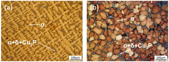 Figure 4 shows the as-cast microstructures and semi-solid slurry microstructures of ZCuSn10P1 alloy. The as-cast sample was obtained by direct water quenching of the molten at 1050 °C. The processing parameters of ECSC were a pouring temperature of 1080 °C, and the pouring length and angle of 300 mm and 45°, respectively. As can be seen, the two types of samples are mainly composed of primary α-Cu and (α+δ +Cu3P) phases. The primary α-Cu phase is the coarse mesh dendritic structure and the (α+δ +Cu3P) phase is distributed in the dendrite clearance in as-cast samples (Figure 4a). The primary α-Cu become worm-like grains or equiaxed grains by ECSC process (Figure 4b). The primary α-Cu was surrounded by a liquid phase, the solid grain filling together with the liquid phase in the process of forming improved the synergistic effect of solid-liquid flows. Note that the liquid content shown in the micrographs is not suggested: the number present at temperature because the quench rate is not rapid enough for the content of liquid to be entirely “frozen in” [16]. During the quench, some liquid deposits onto the solid, appearing to be “solid” in the quenched microstructure [16,17].