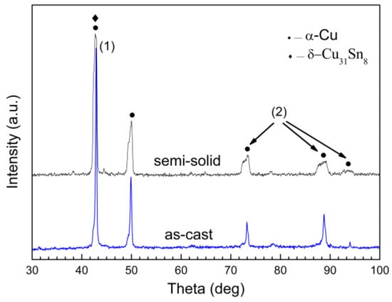 Phase identification was accomplished by comparison of the observed XRD peaks with published crystallographic data (JCPDS database, International Centre for Diffraction Data, Powder Diffraction Standards Joint Committee, Newtown Square, PA, USA). Figure 5 shows the XRD traces from as-cast and semi-solid slurry of the ZCuSn10P1 alloy. Primary α-Cu and δ-Cu31Sn8 were detected in as-cast sample and semi-solid sample; the Cu3P phase was not detected, but the Cu3P phase was nevertheless present [18]. Some peaks become weaker and wider (as shown in Figure 5, marked “2”), indicating that the grains were more refined (see also Figure 4).