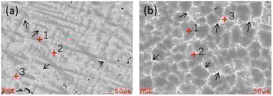 Figure 6 shows the as-cast and semi-solid slurry SEM micrograph of ZCuSn10P1 alloy. They are composed of three regions due to the different tin mass fraction (dark grey areas, light grey areas, and bright white areas). The points showing EDS are marked in Figure 6 and the EDS results are listed in Table 2. The tin mass fraction gradually increases as the color becomes lighter, as indicated by the arrows in Figure 6. The EDS results contrast the as-cast and semi-solid slurry: the tin mass fraction in the α-Cu phase of semi-solid slurry is higher than the as-cast, and the tin mass fraction in the liquid phase of the semi-solid is lower than the as-cast, indicating that the distribution of tin is relatively uniform in the semi-solid slurry and less segregated. Some peak shift (as shown in Figure 5, marked “1”) indicated that the solid solubility of tin has changed (consistent with Table 2). The Cu3P phase is lamellar structure and distributed on the edge of the primary α-Cu phase [18]. It may be affected by the Cu3P phase when measuring two- or three-point energy spectrum, and shows the accumulation of P near primary α-Cu phase.
